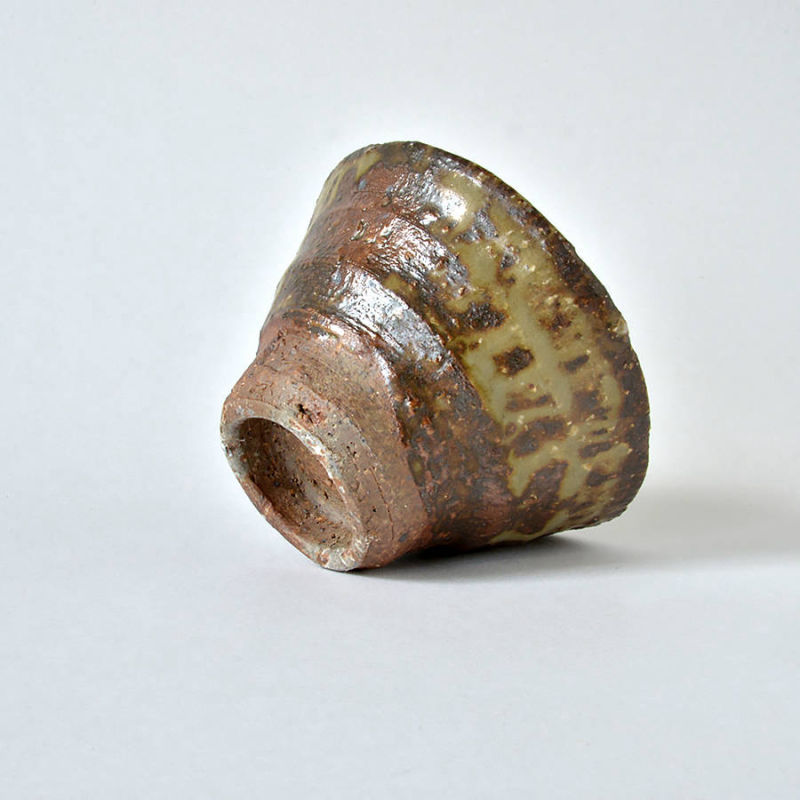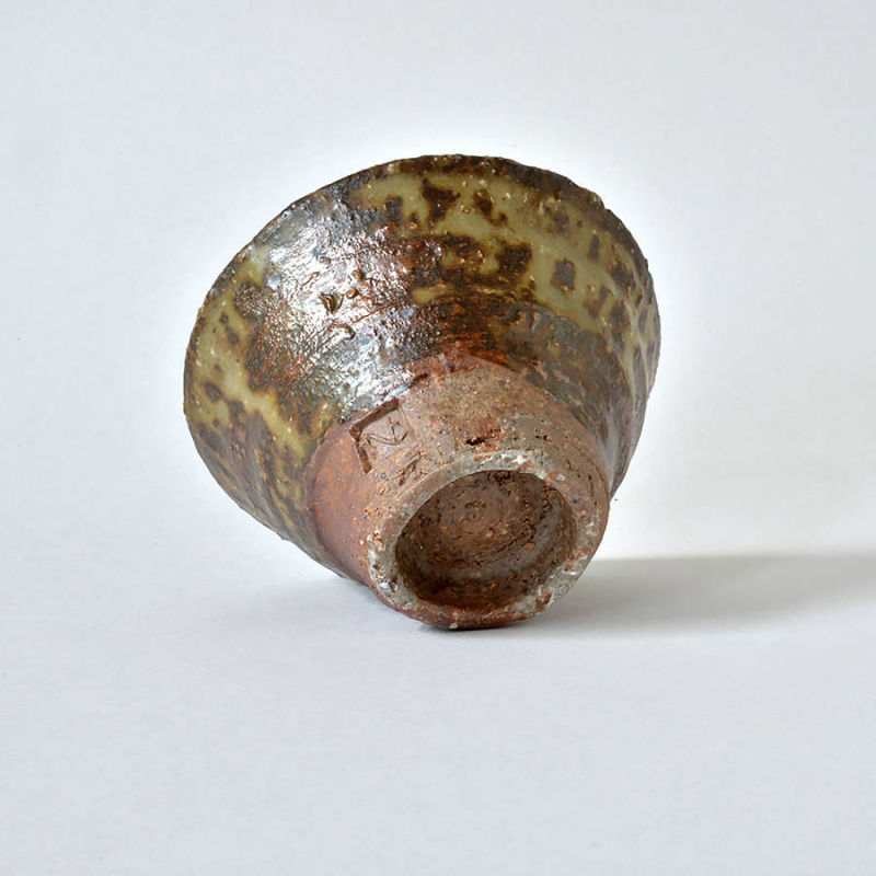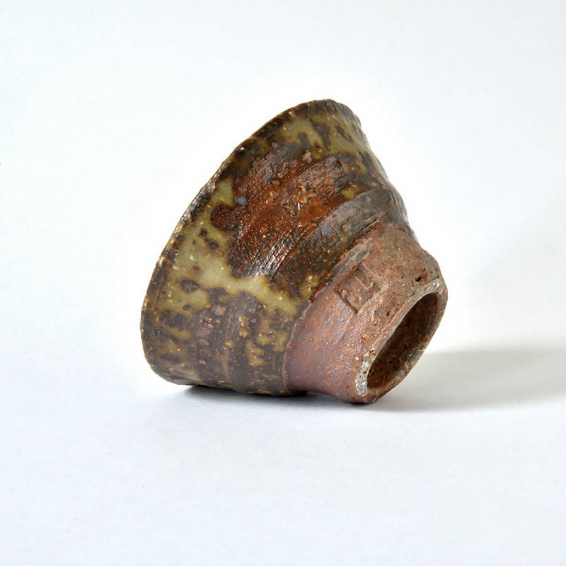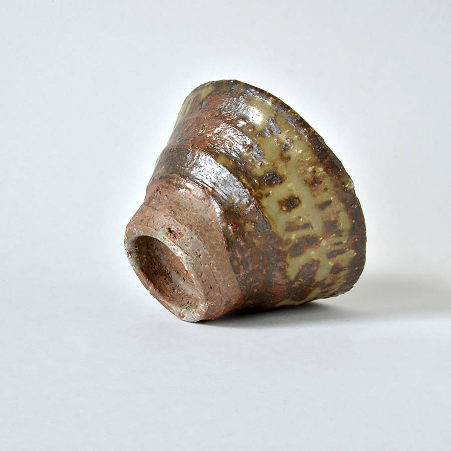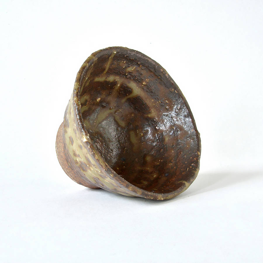 wheel thrownmix of several types of clay, with white slip, painted with fire and natural ash glazed in woodfired kiln. 1320 st. C dimensions: ⌀ 8 cm; h 4,5 cm capacity: 80 ml